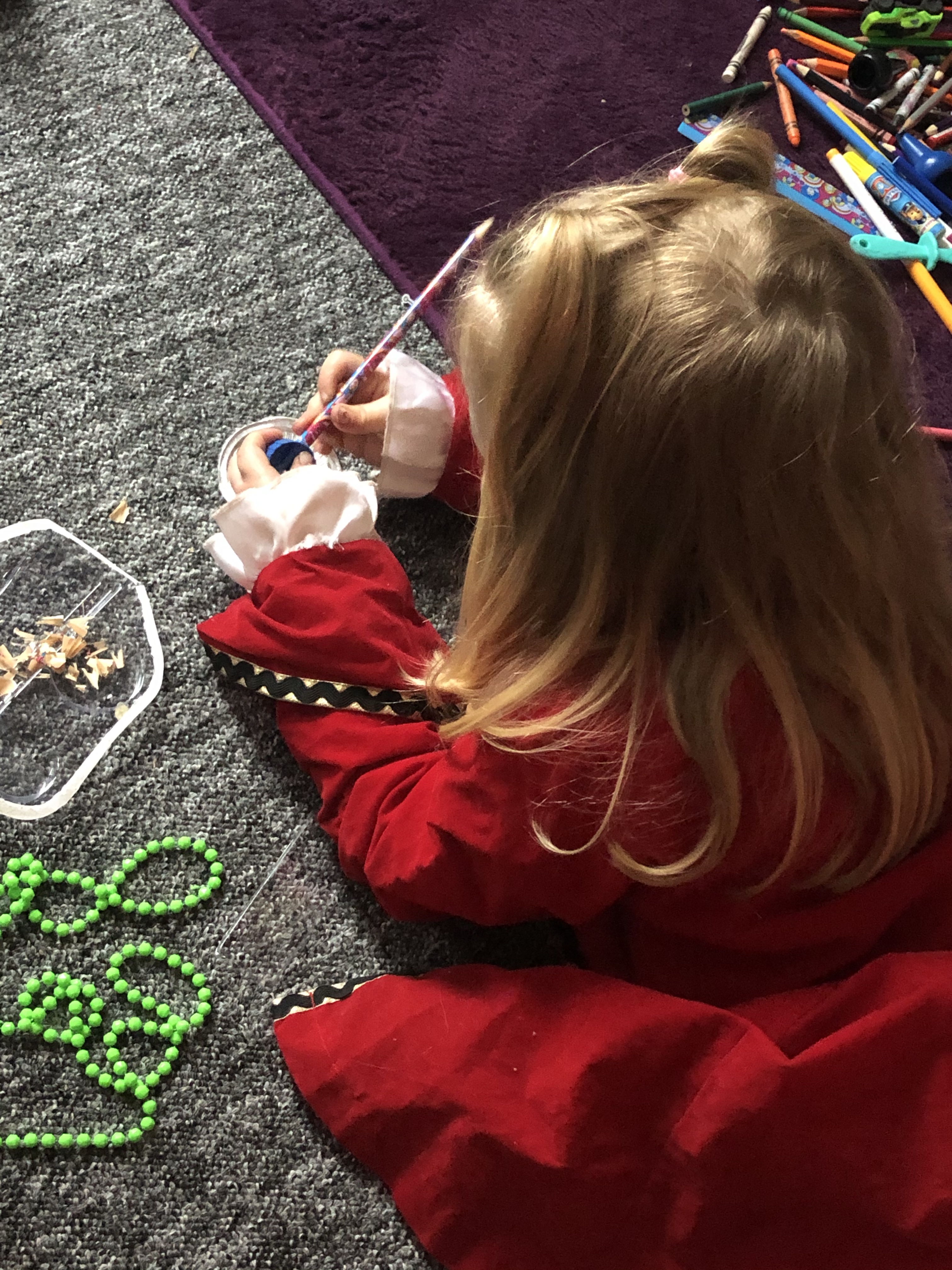 So for twenty minutes, she was totally engaged in her work. And yeah, there were pencil shavings on the carpet, but she was using a whole lot of fine motor skills, and her concentration was just wonderful to observe.